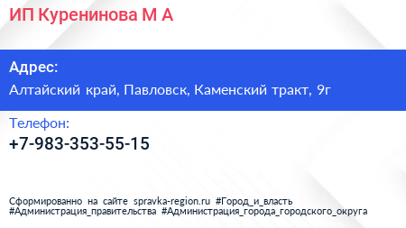 ИП Куренинова М.А. по адресу Алтайский край, Павловск, Каменский тракт, 9г в дальнейшем Организация, размещена в следующих категориях: