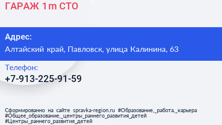 ГАРАЖ 1’m, СТО по адресу Алтайский край, Павловск, улица Калинина, 63 в дальнейшем Организация, размещена в следующих категориях: