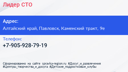 Лидер, СТО по адресу Алтайский край, Павловск, Каменский тракт, 9е в дальнейшем Организация, размещена в следующих категориях: