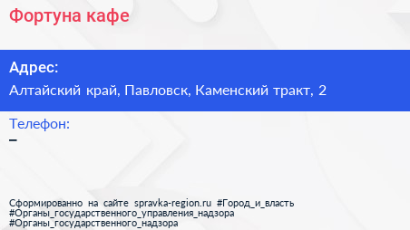 Фортуна, кафе по адресу Алтайский край, Павловск, Каменский тракт, 2 в дальнейшем Организация, размещена в следующих категориях: