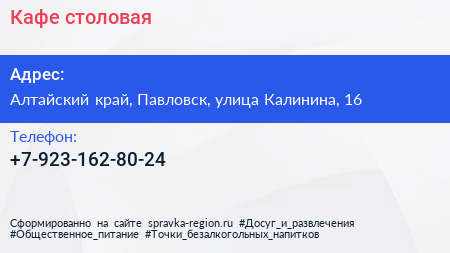 Кафе-столовая по адресу Алтайский край, Павловск, улица Калинина, 16 в дальнейшем Организация, размещена в следующих категориях: