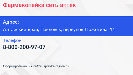 Фармакопейка, сеть аптек по адресу Алтайский край, Павловск, переулок Пожогина, 11 в дальнейшем Организация, размещена в следующих категориях: