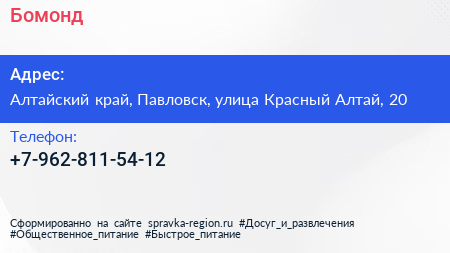 Бомонд по адресу Алтайский край, Павловск, улица Красный Алтай, 20 в дальнейшем Организация, размещена в следующих категориях:
