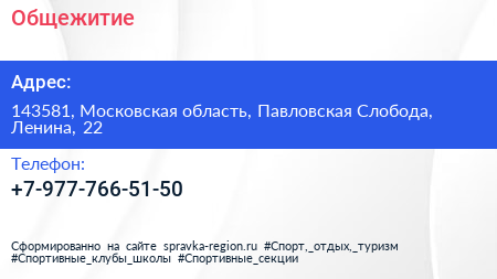 Общежитие по адресу 143581, Московская область, Павловская Слобода, Ленина, 22 в дальнейшем Организация, размещена в следующих категориях: