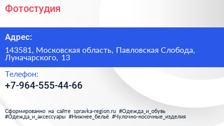 Фотостудия по адресу 143581, Московская область, Павловская Слобода, Луначарского, 13 в дальнейшем Организация, размещена в следующих категориях: