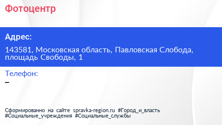 Фотоцентр по адресу 143581, Московская область, Павловская Слобода, площадь Свободы, 1 в дальнейшем Организация, размещена в следующих категориях: