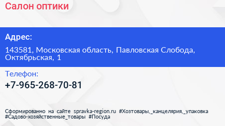 Салон оптики по адресу 143581, Московская область, Павловская Слобода, Октябрьская, 1 в дальнейшем Организация, размещена в следующих категориях: