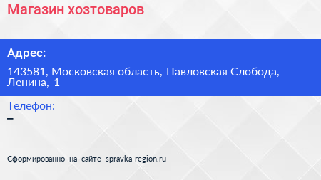Магазин хозтоваров по адресу 143581, Московская область, Павловская Слобода, Ленина, 1 в дальнейшем Организация, размещена в следующих категориях: