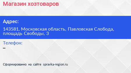 Магазин хозтоваров по адресу 143581, Московская область, Павловская Слобода, площадь Свободы, 3 в дальнейшем Организация, размещена в следующих категориях: