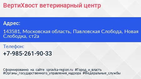 ВертиХвост, ветеринарный центр по адресу 143581, Московская область, Павловская Слобода, Новая Слободка, ст2а в дальнейшем Организация, размещена в следующих категориях: