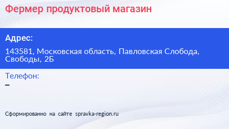 Фермер, продуктовый магазин по адресу 143581, Московская область, Павловская Слобода, Свободы, 2Б в дальнейшем Организация, размещена в следующих категориях: