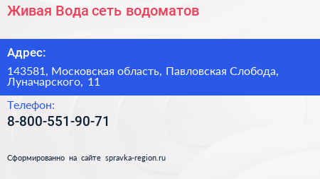 Живая Вода, сеть водоматов по адресу 143581, Московская область, Павловская Слобода, Луначарского, 11 в дальнейшем Организация, размещена в следующих категориях:
