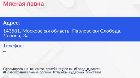 Мясная лавка по адресу 143581, Московская область, Павловская Слобода, Ленина, 3а в дальнейшем Организация, размещена в следующих категориях:
