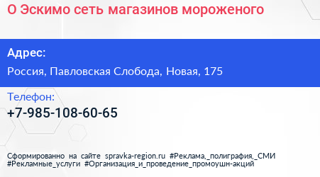 О! Эскимо, сеть магазинов мороженого по адресу 163, Новая улица, Коттеджный посёлок «Покровский», Красный Посёлок, городской округ Истра, Московская область, Центральный федеральный округ, 143582, Россия в дальнейшем Организация, размещена в следующих категориях: