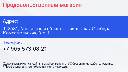 Продовольственный магазин по адресу 143581, Московская область, Павловская Слобода, Комсомольская, 3 ст1 в дальнейшем Организация, размещена в следующих категориях: