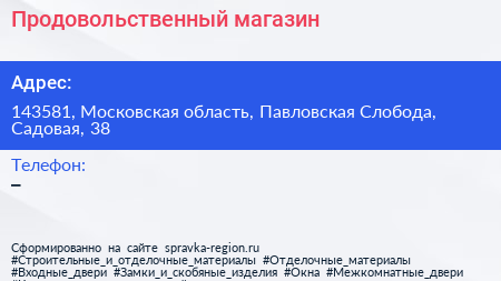 Продовольственный магазин по адресу 143581, Московская область, Павловская Слобода, Садовая, 38 в дальнейшем Организация, размещена в следующих категориях: