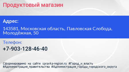 Продуктовый магазин по адресу 143581, Московская область, Павловская Слобода, Молодёжная, 50 в дальнейшем Организация, размещена в следующих категориях: