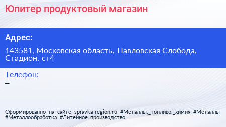 Юпитер, продуктовый магазин по адресу 143581, Московская область, Павловская Слобода, Стадион, ст4 в дальнейшем Организация, размещена в следующих категориях: