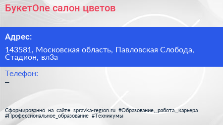 БукетOne, салон цветов по адресу 143581, Московская область, Павловская Слобода, Стадион, вл3а в дальнейшем Организация, размещена в следующих категориях: