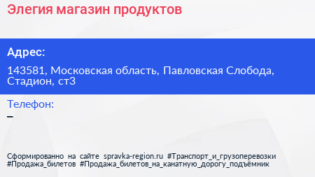 Элегия, магазин продуктов по адресу 143581, Московская область, Павловская Слобода, Стадион, ст3 в дальнейшем Организация, размещена в следующих категориях: