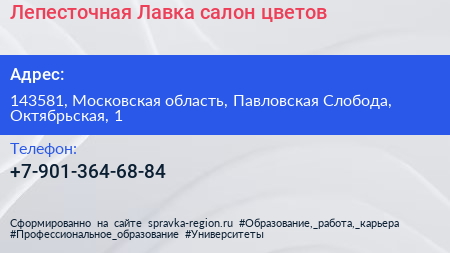 Лепесточная Лавка, салон цветов по адресу 143581, Московская область, Павловская Слобода, Октябрьская, 1 в дальнейшем Организация, размещена в следующих категориях: