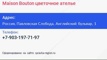Maison Bouton, цветочное ателье по адресу Английский бульвар, Коттеджный посёлок «Кембридж», Красный Посёлок, городской округ Истра, Московская область, Центральный федеральный округ, 143582, Россия в дальнейшем Организация, размещена в следующих категориях:
