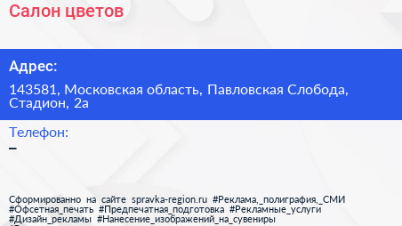 Салон цветов по адресу 143581, Московская область, Павловская Слобода, Стадион, 2а в дальнейшем Организация, размещена в следующих категориях: