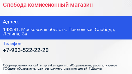 Слобода, комиссионный магазин по адресу 143581, Московская область, Павловская Слобода, Ленина, 3а в дальнейшем Организация, размещена в следующих категориях: