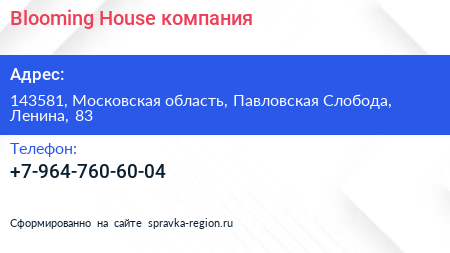 Blooming House, компания по адресу 143581, Московская область, Павловская Слобода, Ленина, 83 в дальнейшем Организация, размещена в следующих категориях: