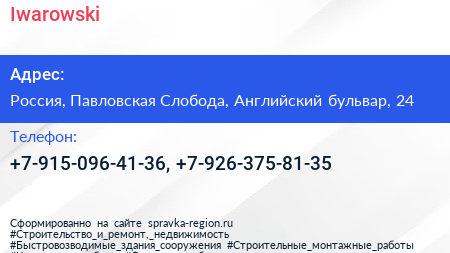 Iwarowski по адресу 24, Английский бульвар, Коттеджный посёлок «Кембридж», Красный Посёлок, городской округ Истра, Московская область, Центральный федеральный округ, 143582, Россия в дальнейшем Организация, размещена в следующих категориях: