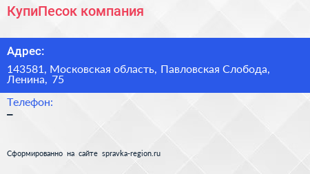 КупиПесок, компания по адресу 143581, Московская область, Павловская Слобода, Ленина, 75 в дальнейшем Организация, размещена в следующих категориях: