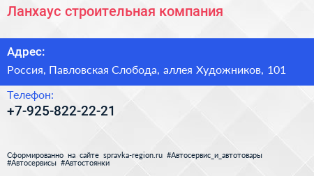 Ланхаус, строительная компания по адресу 101, аллея Художников, КП «Резиденция Бенелюкс», Резиденция Бенелюкс, Чесноково, городской округ Истра, Московская область, Центральный федеральный округ, 143581, Россия в дальнейшем Организация, размещена в следующих категориях: