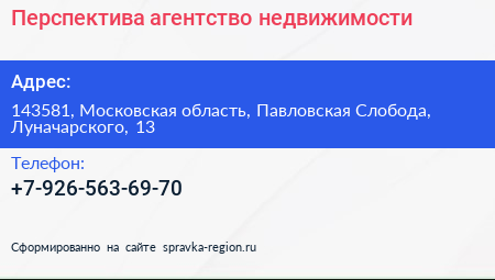 Перспектива, агентство недвижимости по адресу 143581, Московская область, Павловская Слобода, Луначарского, 13 в дальнейшем Организация, размещена в следующих категориях: