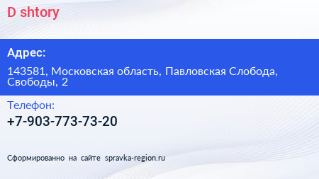 D-shtory по адресу 143581, Московская область, Павловская Слобода, Свободы, 2 в дальнейшем Организация, размещена в следующих категориях: