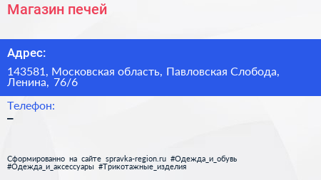 Магазин печей по адресу 143581, Московская область, Павловская Слобода, Ленина, 76/6 в дальнейшем Организация, размещена в следующих категориях: