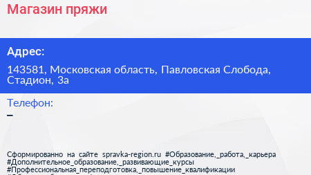 Магазин пряжи по адресу 143581, Московская область, Павловская Слобода, Стадион, 3а в дальнейшем Организация, размещена в следующих категориях: