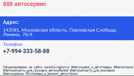 888, автосервис по адресу 143581, Московская область, Павловская Слобода, Ленина, 76/4 в дальнейшем Организация, размещена в следующих категориях: