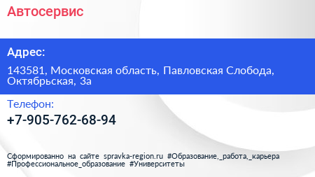 Автосервис по адресу 143581, Московская область, Павловская Слобода, Октябрьская, 3а в дальнейшем Организация, размещена в следующих категориях: