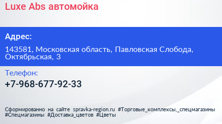 Luxe Abs, автомойка по адресу 143581, Московская область, Павловская Слобода, Октябрьская, 3 в дальнейшем Организация, размещена в следующих категориях: