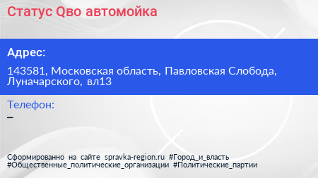 Статус Qво, автомойка по адресу 143581, Московская область, Павловская Слобода, Луначарского, вл13 в дальнейшем Организация, размещена в следующих категориях: