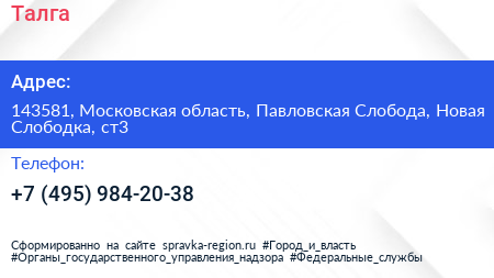 Талга по адресу 143581, Московская область, Павловская Слобода, Новая Слободка, ст3 в дальнейшем Организация, размещена в следующих категориях: