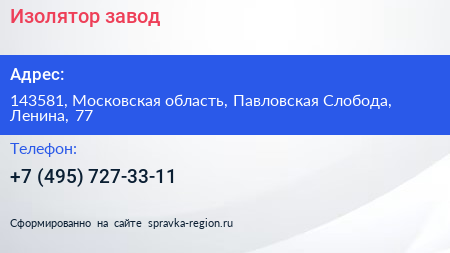 Изолятор, завод по адресу 143581, Московская область, Павловская Слобода, Ленина, 77 в дальнейшем Организация, размещена в следующих категориях: