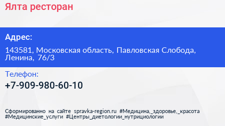 Ялта, ресторан по адресу 143581, Московская область, Павловская Слобода, Ленина, 76/3 в дальнейшем Организация, размещена в следующих категориях: