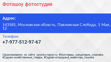 Фотошоу, фотостудия по адресу 143581, Московская область, Павловская Слобода, 1 Мая, 12 в дальнейшем Организация, размещена в следующих категориях: