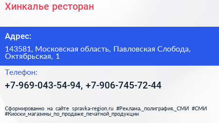 Хинкалье, ресторан по адресу 143581, Московская область, Павловская Слобода, Октябрьская, 1 в дальнейшем Организация, размещена в следующих категориях: