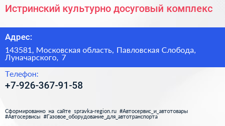 Истринский культурно-досуговый комплекс по адресу 143581, Московская область, Павловская Слобода, Луначарского, 7 в дальнейшем Организация, размещена в следующих категориях: