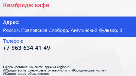 Кембридж, кафе по адресу Английский бульвар, Коттеджный посёлок «Кембридж», Красный Посёлок, городской округ Истра, Московская область, Центральный федеральный округ, 143582, Россия в дальнейшем Организация, размещена в следующих категориях: