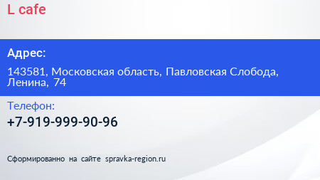 L-cafe по адресу 143581, Московская область, Павловская Слобода, Ленина, 74 в дальнейшем Организация, размещена в следующих категориях: