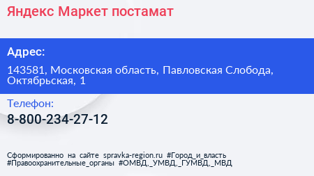Яндекс.Маркет, постамат по адресу 143581, Московская область, Павловская Слобода, Октябрьская, 1 в дальнейшем Организация, размещена в следующих категориях:
