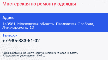Мастерская по ремонту одежды по адресу 143581, Московская область, Павловская Слобода, Луначарского, 13 в дальнейшем Организация, размещена в следующих категориях: